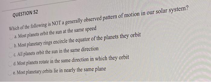 Which of the following is not a pattern of motion in our solar system?. Which of the following is not a pattern of motion in our solar system a Planets Which of the following is not a pattern of motion in School University of Tennessee. Which of the following is not a major pattern of motion in the solar system. BMost planets orbit at the same speed.